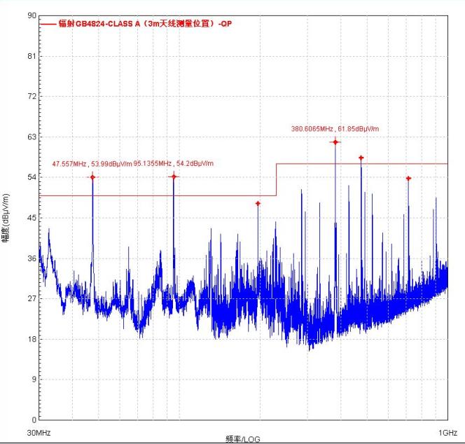 辐射发射:存在47.5Mhz、95、142.6、380、428、475.6MHz均为47.5MHz倍频,该频率主要来源于激光发生器和主控板,其中47.5MHz多次谐波信号通过电源线和信号线形成共模干扰,产生空间辐射发射。