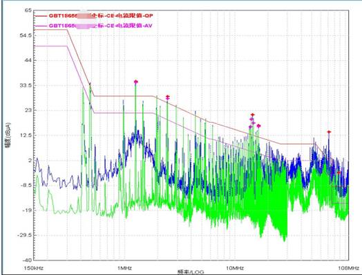 传导发射(电压法):电流钳在50mm、750mm处时,其测试结果的QP值、AV值在28MHz~108MHz均不符合规定限值,且以总体包络噪声呈现。
